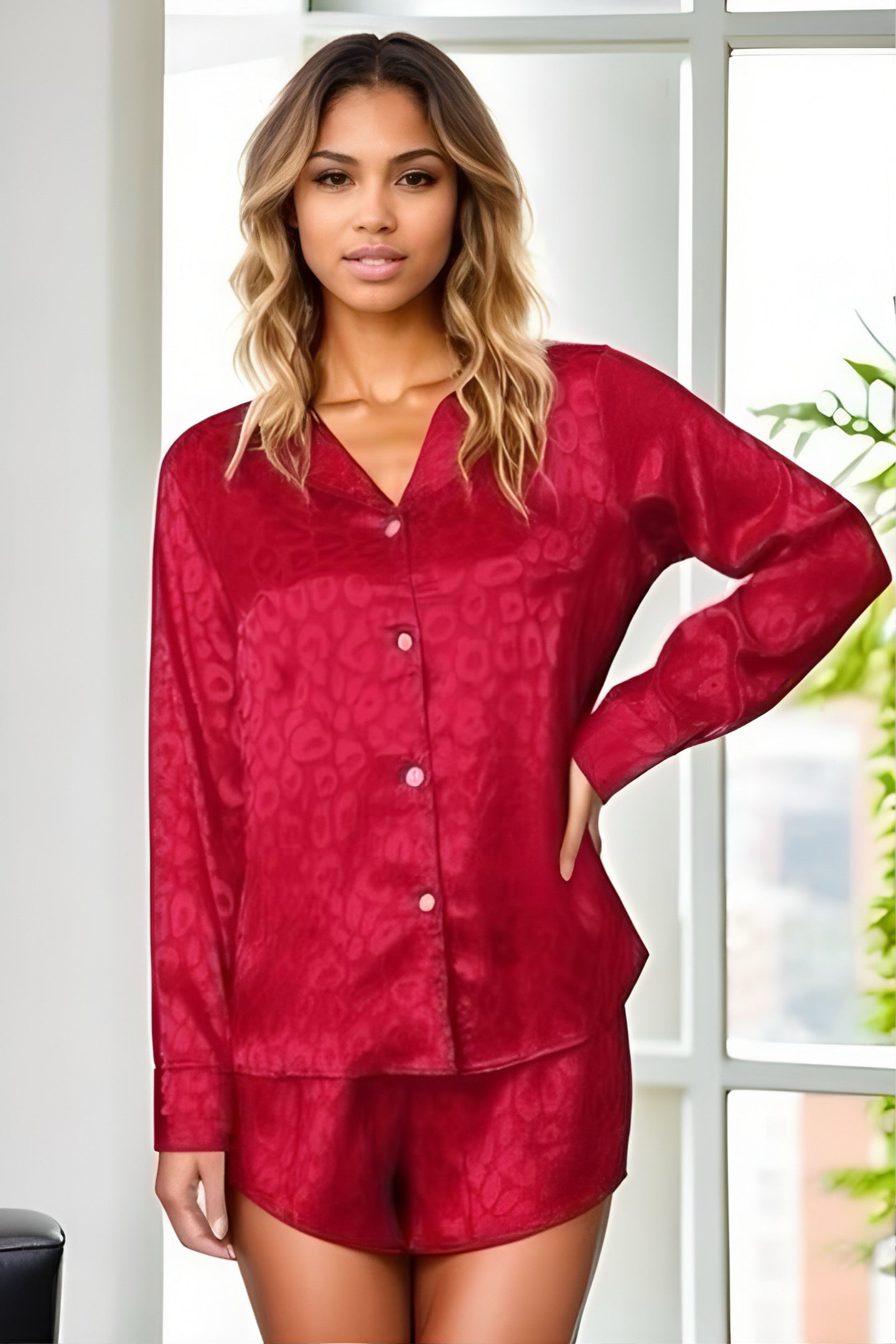 Turn up the heat with the Radiant Rouge Set. Designed with a rich satin finish and leopard texture, this set offers a sophisticated spin on loungewear. Perfectly tailored for comfort, it’s the ultimate blend of bold and cozy.